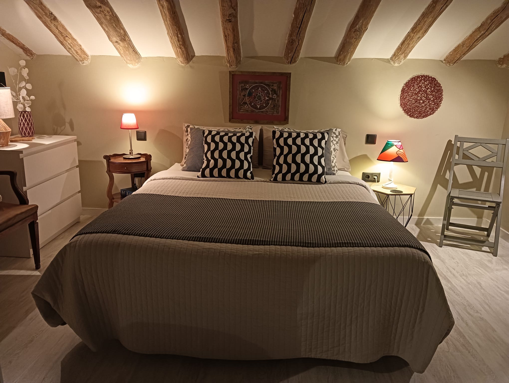 El ático está situado en un edificio Histórico – Artístico del siglo XIX en la céntrica Plaza de Santa Cruz dónde hemos conservado todos los elementos estructurales del edificio.